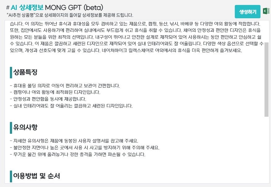 그리고 제작된 상품명으로 상세페이지 내용을 AI가 자동으로 뽑아줍니다.