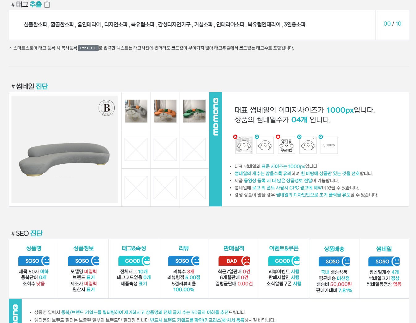- SEO추출진단 : URL 입력 시 26개 항목으로 상품의 SEO상태를 추출 진단해 줌