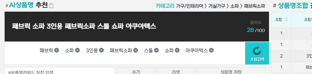 "3인용 패브릭 소파"만 입력했을 뿐인데 엠디몽의 AI가 이런 상품명 결과를 즉석으로 만들어 주었습니다.