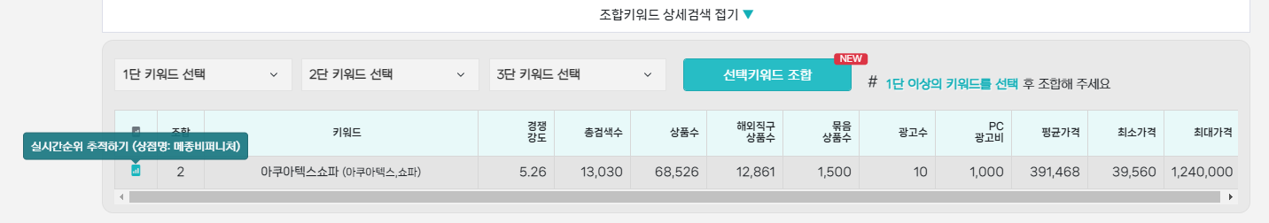 그동안 사용해 왔던 키워드 마스터나 아이템 스카우트 등의 키워드 플랫폼에서는 상품명을 제작 후 수십개의 조합의 경우를 하나씩 찾아서 검색 했지만
