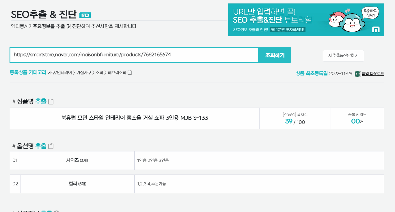SEO추출&진단 - URL만 입력하면 내 상품의 SEO상태를 추출 및 진단해 줍니다. 내 상품뿐만 아니라 경쟁업체 혹은 벤치마킹할 업체의 정보까지도 추출 및 진단이 가능합니다.