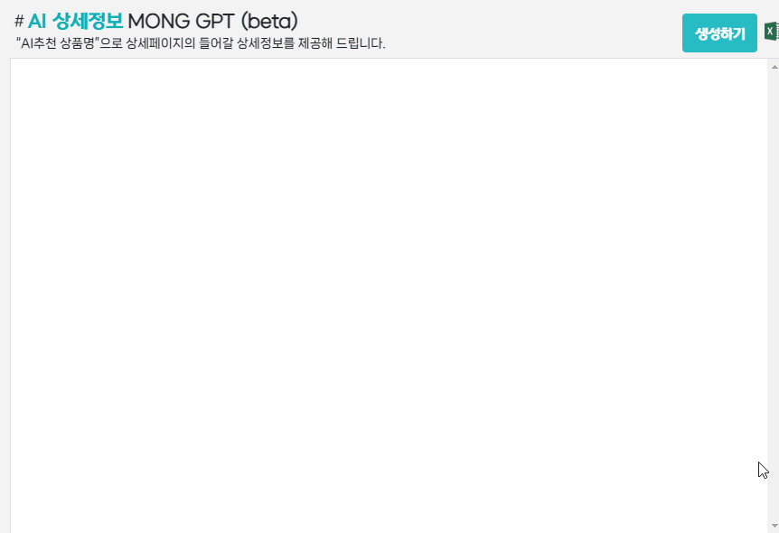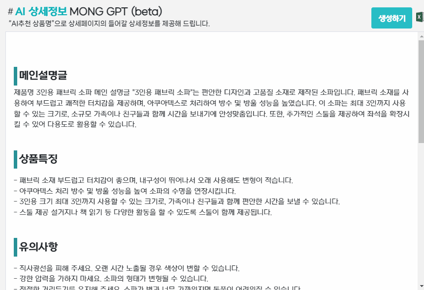 만들어진 AI상품명으로 상세페이지 설명을 만들어 보겠습니다. 그냥 '생성하기' 버튼을 눌러주시면 됩니다