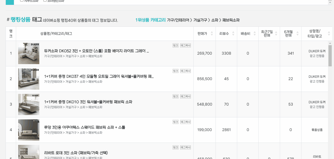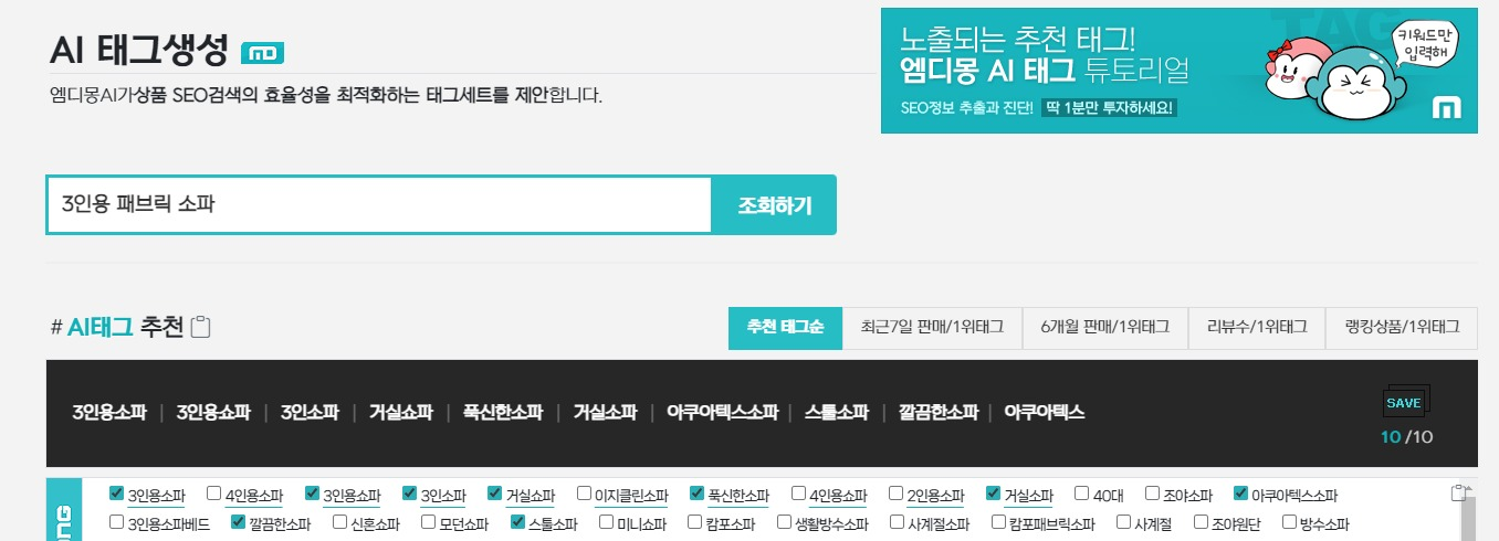 AI 상품명에서 입력했던 엠디몽 AI 태그생성 메뉴에 "3인용 패브릭 소파"를 그대로 입력해 보겠습니다