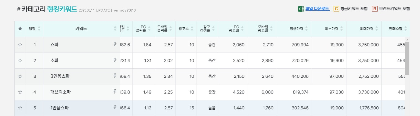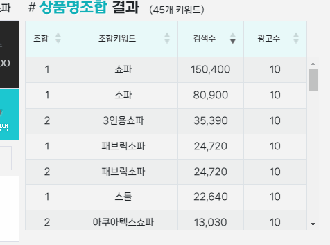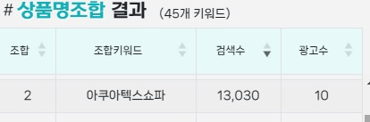 예를 들어 '아쿠아텍스 쇼파'라는 키워드는 검색수 13,030에 광고수 10건 입니다.